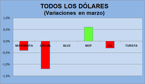 pero el dólar oficial y el blue bajaron 0,7% cada uno.
