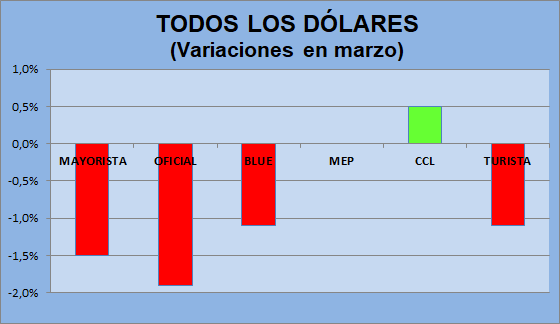 pero el dólar oficial y el blue bajaron 0,7% cada uno.